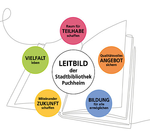 Das Leitbild beinhaltet fünf Leitsätze: Raum für Teilhabe schaffen. Qualitätsvolles Angebot sichern. Bildung für alle ermöglichen. Miteinander Zukunft schaffen. Vielfalt leben.