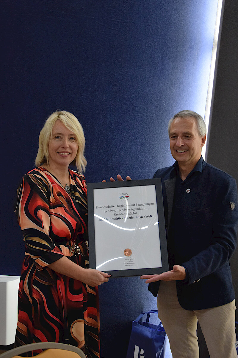 Foto: Beim Empfang des Ersten Bürgermeisters Jácint Horváth von Nagykanizsa übergab Puchheims Erster Bürgermeister Norbert Seidl (rechts) den Friedensspruch.