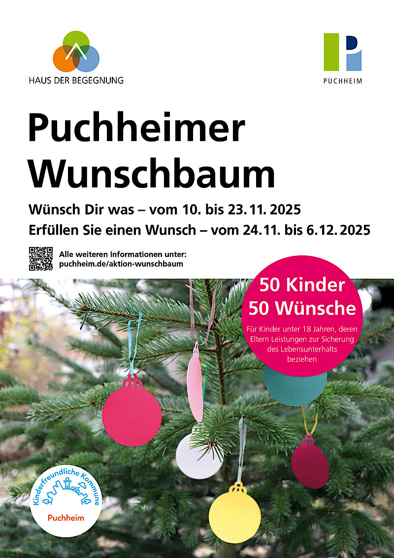 Im Rahmen der Kinderfreundlichen Kommune soll die diesjährige Aktion „Puchheimer Wunschbaum“ wieder bedürftigen Puchheimer Kindern einen Wunsch zu Weihnachten erfüllen. Mit der Aktion können 50 Wunscherfüller:innen 50 bedürftigen Kindern 50 Wünsche erfüllen. Ziel der Aktion ist es auch, die lokalen Geschäfte zu unterstützen.