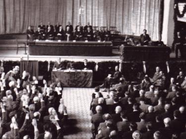 Foto: Eröffnungssitzung der Verfassunggebenden Landesversammlung am 15. Juli 1946 in der Aula der Münchner Universität. (Foto: HdBG)