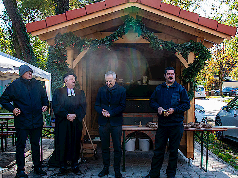 Am Sonntag, 26. Oktober 2025, war es endlich soweit. Unterstützerinnen, Unterstützer und viele Interessierte waren gekommen, um bei der Eröffnung des Backhauses dabei zu sein. Im Anschluss an den ökumenischen Segen durch Pfarrer Alexander Bauer und Pfarrer Stefan Menzel dankte Erster Bürgermeister Seidl in seiner Ansprache unter anderem den vielen freiwilligen Helferinnen und Helfern, die das Brotbackhaus in unzähligen Arbeitsstunden geplant und gebaut sowie den Unternehmen, die Material und Arbeitskraft gespendet haben. Ihm gefalle beim Gemeinschaftsbackhaus ganz besonders die Verbindung des Lebensmittels Brot mit der Gemeinschaft, so der erklärte Brot-Fan Seidl. Auch Sergius Ruppaner hob stellvertretend für die Ehrenamtlichen der Backhaus-Gruppe den Beitrag der vielen Menschen hervor, die beim Bau geholfen, Holz gespendet, Teig vorbereitet oder mit Tipps und Ratschlägen zum Betrieb unterstützt haben.